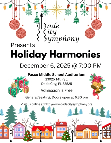 Join us in the Pasco Middle School Auditorium on December 6, 2025, at 7:00 pm for our free Christmas concert, where we will play a selection of holiday classics, including, A Christmas Festival, A Swingin' Holiday, Hallelujah Chorus, Messiah, Have Yourself a Merry Little Christmas, How the Grinch Stole Christmas, Nutcracker Suite, Parade of the Wooden Soldiers, Patapan, Sleigh Ride, Stille Nacht, The Christmas Waltz, There's Christmas in the Air, and Winter Wonderland.